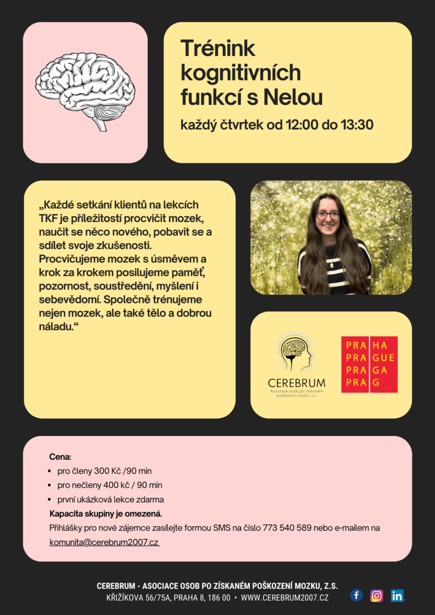 Skupinový TKF vnímám jako přátelská setkání s uvolněnou atmosférou, kde si můžeme společně procvičit mozek, bavit se a vzájemně se motivovat. Do tréninku zapojuji prvky různých her i praktických dovedností, aby byla setkání zábavná a zároveň pomáhala klientům získat jistotu a nezávislost v každodenním fungování. Mým cílem je podporovat každého klienta v jeho vlastním tempu, rozvíjet jeho silné stránky a společně hledat strategie, které mu pomohou lépe zvládat nároky všedního dne.