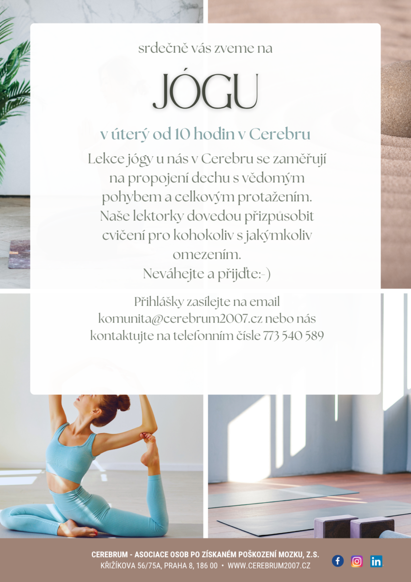 V úterý vás jogínky Saša nebo Zuzana provedou svojí lekcí přizpůsobenou osobám se zdravotním postižením. Obě se zaměřují na propojení dechu s vědomým pohybem a na radost, která pohyb doprovází. Jejich jóga je vhodná pro každého. Jóga je způsob, jak se spojit se svým tělem i duší.