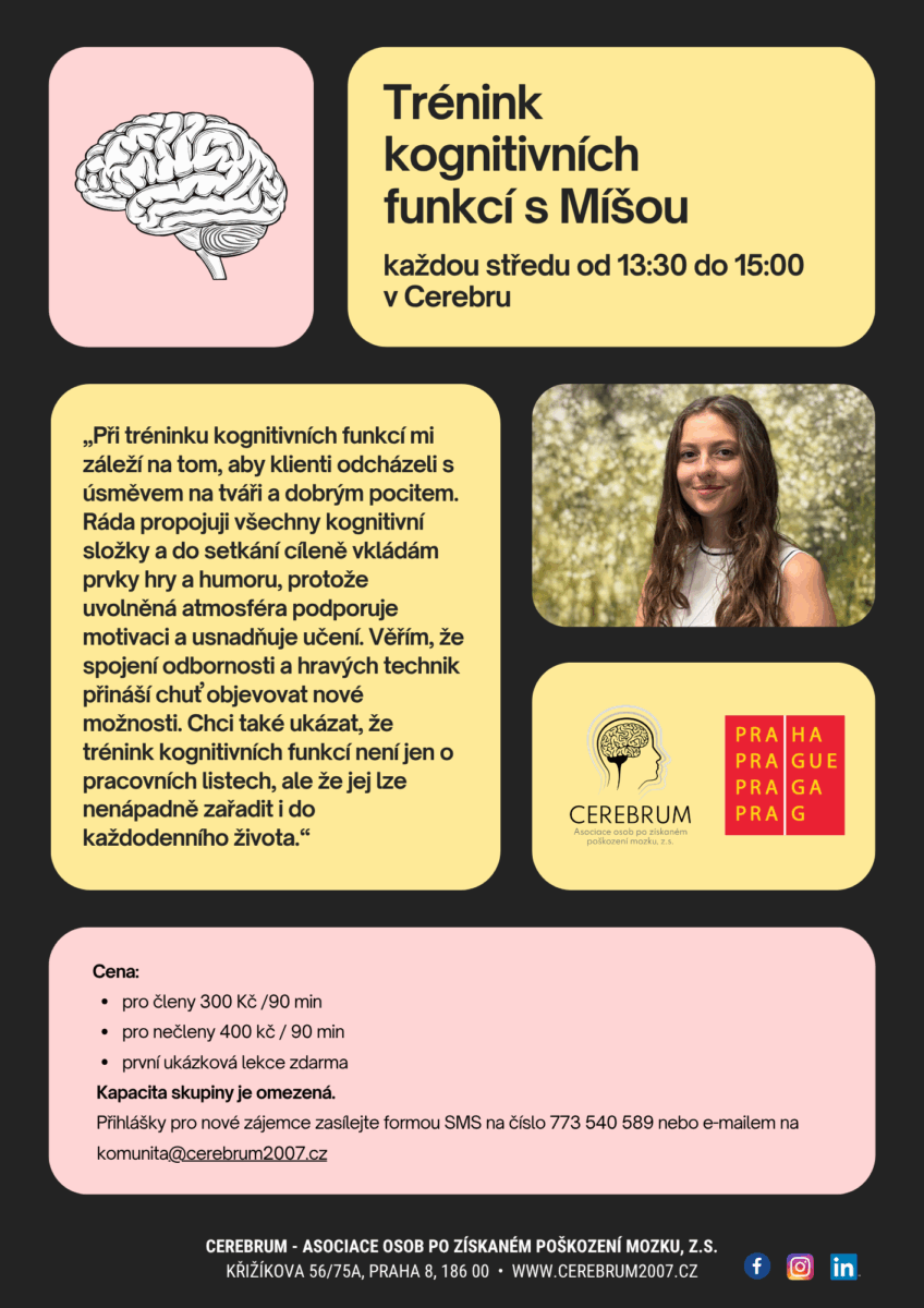 „Při tréninku kognitivních funkcí mi záleží na tom, aby klienti odcházeli s úsměvem na tváři a dobrým pocitem. Ráda propojuji všechny kognitivní složky a do setkání cíleně vkládám prvky hry a humoru, protože uvolněná atmosféra podporuje motivaci a usnadňuje učení. Věřím, že spojení odbornosti a hravých technik přináší chuť objevovat nové možnosti. Chci také ukázat, že trénink kognitivních funkcí není jen o pracovních listech, ale že jej lze nenápadně zařadit i do každodenního života.“
