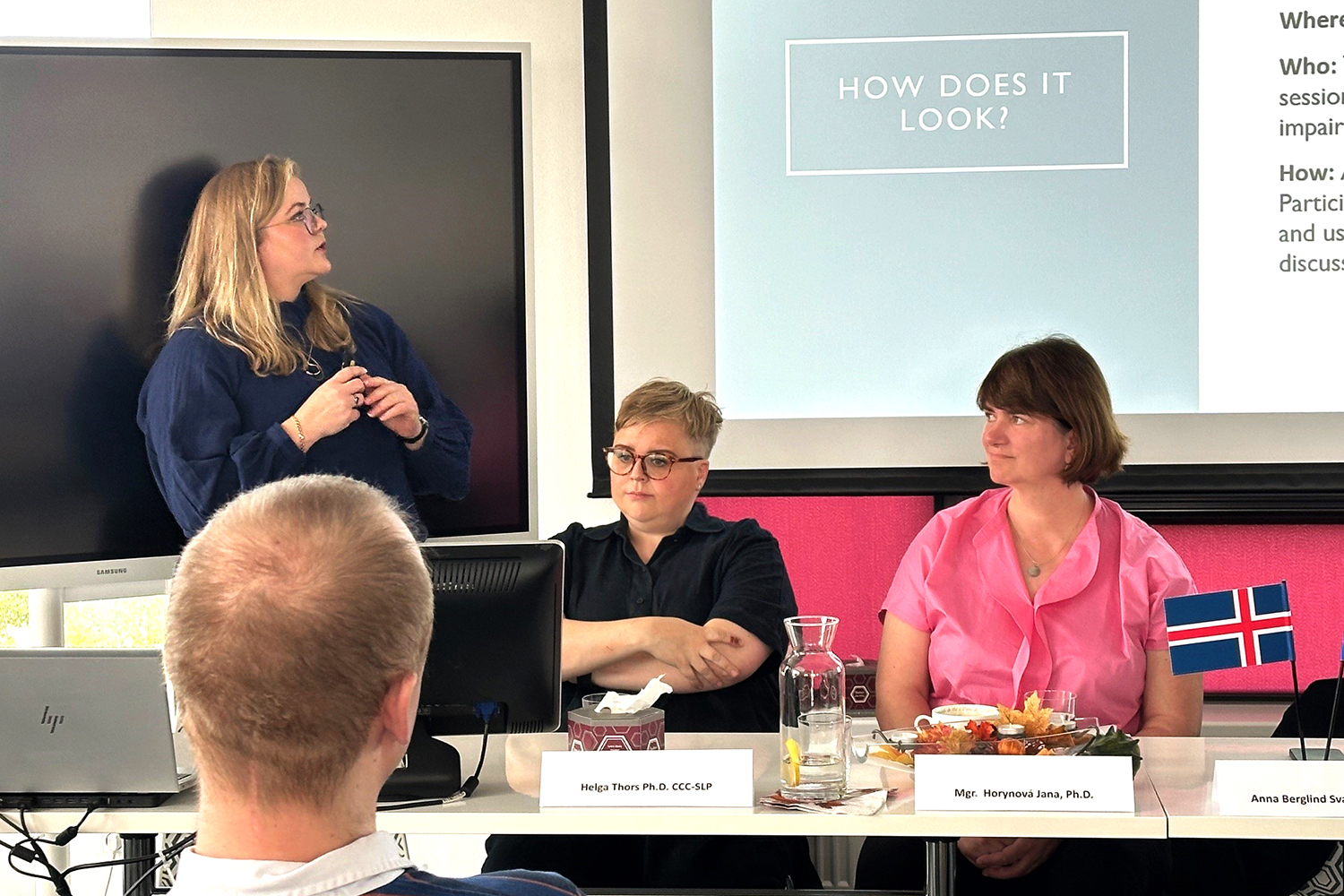 Paní Thorrun představila speciální aplikaci „SLAG“, kterou si zájemci vyplní v telefonu předem jako prevenci proti mrtvici. V zemi je asi 380.000 obyvatel na poměrně velkém území, kde sousedi bydlí i desítky kilometrů a pomoc není na dosah. V případě, že jedinec začne vykazovat příznaky mozkové příhody, stačí zmáčknout bod na aplikaci a GPS Vás zaměří na 10 metrů, záchranáři tedy vědí, že máte symptomy CMP a vyráží. Paní Helga prezentovala téma o životě s afázií na Islandu – od akutní po chronickou fázi a paní Anna hovořila o skupinové logopedické terapii neurologických pacientů s afázií na Islandu.