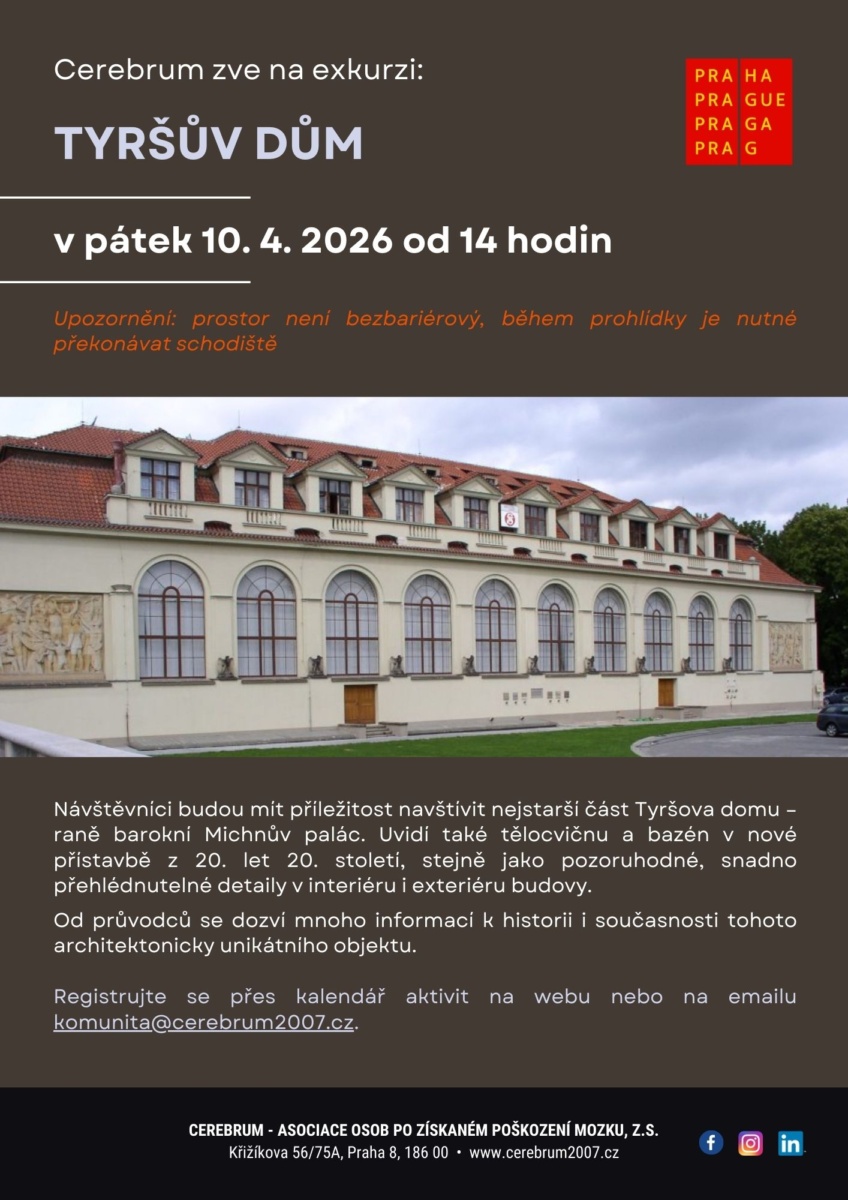 KDE: sraz je na nádvoří u sochy Dr. Miroslava Tyrše – vstup do Tyršova domu z ulice Újezd od tramvajové zastávky Tyršův dům (dříve zastávka Hellichova).